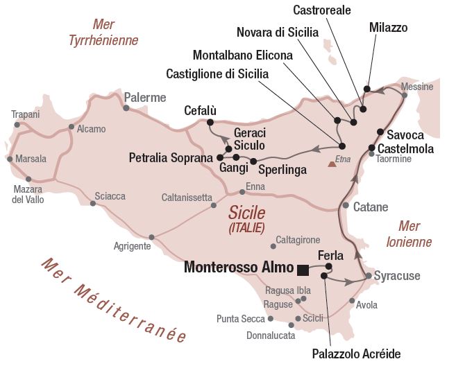 Les secrets de la Sicile en un circuit de 7 jours Accueil / Contenus / Europe / Italie / Les secrets de la Sicile en un circuit de 7 jours Castelmola | © iStockphoto.com/j-wildman Extrait du guide : Italie - 50 itinéraires de rêve Papier (livre entier) 39,95 $ Italie – 50 itinéraires de rêve, un beau livre qui vous fera voyager dès la première page. Voir la suite De Monterosso Almo jusqu’à Cefalù, chacun des villages siciliens qui s’alignent sur les côtes de la Méditerranée ou se dressent dans l’arrière-pays trouve une façon de se démarquer. Tantôt l’ambiance du passé invite à la flânerie, tantôt l’architecture traditionnelle inspire un moment de contemplation. Partout, c’est l’émouvante authenticité de la Sicile que l’on se plaît à découvrir sans aucune modération, un jour à la fois. Jour 1 - Monterosso Almo – Ferla – Palazzolo Acréide 45 km Véritable jardin d’éden, Monterosso Almo jouit d’une situation enviable dans les montagnes. Rendez-vous sur la place San Giovanni pour sentir battre le cœur du village, puis prenez la route de Ferla. Situé sur un plateau planté d’amandiers et d’oliviers centenaires, ce village renferme un remarquable ensemble de bâtiments ecclésiastiques qui s’imposent comme de très beaux exemples du baroque sicilien. À Palazzolo Acréide, vous trouverez les vestiges d’un théâtre grec et d’un temple d’Aphrodite qui méritent le détour. Jour 2 - Palazzolo Acréide – Castelmola – Savoca 160 km Rendez-vous ce matin à Castelmola. Balcon naturel surplombant Taormina, l’endroit jouit d’une vue vertigineuse sur la mer Ionienne et sur la côte calabraise, avec une douce brise méditerranéenne en prime. Poussez votre exploration ensuite jusqu’à Savoca, où vous risquez de vous retrouver dans un décor familier puisque Francis Ford Coppola y a tourné, dans le petit Bar Vitelli, quelques scènes du film Le Parrain. Jour 3 - Savoca – Milazzo – Castroreale 100 km Milazzo vous invite à profiter de son front de mer en faisant une belle passeggiata avant d’entamer l’ascension des escaliers de la côte San Domenico pour vous rendre à la citadelle militaire héritée des Aragonais qui, encore aujourd’hui, veille sur cette petite ville, porte d’entrée des îles Éoliennes. Dirigez-vous ensuite vers l’arrière-pays pour atteindre Castroreale, symbiose d’art et de nature. Les panoramas sur Milazzo et les Éoliennes, conjugués aux œuvres de marbre du village, en font un incontournable. Jour 4 - Castroreale – Novara di Sicilia – Montalbano Elicona 75 km Cap sur Novara di Sicilia, juchée sur un éperon rocheux. Celle qu’on appelle aussi le « Triomphe des Pierres » s’enorgueillit de ses pavés historiques et de ses façades de palais tous en pierres provenant des carrières locales. Poursuivez jusqu’à Montalbano Elicona, le « Tibet de Sicile », où Frédéric II d’Aragon venait passer l’été dans son palais royal, toujours bien conservé. Jour 5 - Montalbano Elicona – Castiglione di Sicilia – Sperlinga 135 km En matinée, dirigez-vous vers Castiglione di Sicilia, charmant village perché entre les gorges du fleuve Alcantara et l’Etna. Ses ruelles fleuries, flanquées de somptueuses églises baroques, pourraient toutefois vous faire oublier l’une des pièces architecturales les plus intéressantes de l’époque byzanto-sicilienne : une chapelle qui se trouve aux portes de la ville. Poursuivez ensuite jusqu’à Sperlinga, où vous admirerez un beau château du Moyen Âge et un étonnant ensemble de grottes artificielles creusées dans la roche et reliées entre elles par des escaliers tortueux taillés de mains d’homme. Jour 6 - Sperlinga – Gangi – Petralia Soprana – Geraci Siculo 50 km Roulez vers Gangi, de laquelle émane un doux parfum de montagne, avec, comme toile de fond, le plus haut sommet de l’île. N’hésitez pas à franchir la muraille pour pénétrer dans le cœur médiéval, puis rendez-vous à Petralia Soprana, qui surplombe la Sicile occidentale. Terminez la journée à Geraci Siculo, oasis de verdure située aux portes du Parco Regionale delle Madonie, où vous prendrez le temps de faire une randonnée pour vous imprégner de la beauté du paysage. Jour 7 - Geraci Siculo – Cefalù - 50 km Faites route vers la côte, en direction de Cefalù. Terre de légendes, terre d’histoires, Cefalù vous offre son regard sur la Méditerranée et sa vue sur les Madonies. Profitez de sa grande tradition d’hospitalité sicilienne imprégnée de l’apport des cultures normande, mauresque et byzantine, chacune venue façonner à sa façon le visage de cette magnifique petite ville côtière. La montée sur la Rocca qui surplombe Cefalù est aride, mais la récompense est grande : un panorama grandiose! Quand y aller? Toute l’année, mais de préférence au printemps ou en automne lorsque le temps se fait plus doux. Inoubliable… Visiter le château de Milazzo, qui raconte un peu de l’histoire troublée et de la culture siciliennes. Croquer dans un arancino ou une arancina pour combler une petite faim au milieu d’un paysage grandiose. Grimper La Rocca, qui domine Cefalù, pour traverser un paysage sauvage et finalement accéder à un panorama splendide. D'autres articles qui pourraient vous intéresser : LE MEILLEUR DE L’ITALIE DU NORD EN 12 JOURS LES MARCHÉS DE NOËL DU TRENTIN-HAUT-ADIGE LA TOSCANE EN 8 EXPÉRIENCES UNIQUES