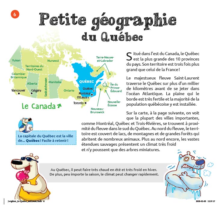 Petite géographie du Québec! Accueil / Contenus / Amérique du Nord / Le Canada, une question de géographie / Le Québec / Petite géographie du Québec! Acropoles des Draveures, Hautes-Gorges-de-la-Rivière-Malbaie © iStock / Vladone Extrait du guide : J'explore le Québec Papier (livre entier) 19,95 $ Unique dans l'édition jeunesse, ce guide de voyage sur le Québec est le seul qui s’adresse aux enfants de 7 à 11 ans! Voir la suite Petite géographie du Québec! Stimuler ses neurones et explorer la géographie du Québec en s’amusant, voici ce que propose cette capsule tirée du guide J’explore le Québec. Savais-tu? Savais-tu que le Bouclier canadien s'étend au nord du fleuve? Il couvre 90% du territoire de la province et il est constitué des roches les plus anciennes de la planète! Le passage d’un glacier il y a 15 000 ans a creusé la vallée de la Jacques-Cartier et celle des hautes gorges de la rivière Malbaie. C’est aussi grâce au mouvement de ce glacier, qui a écrasé, raboté et creusé la croûte terrestre, qu’il y autant de lacs au Québec! Car tous ces trous se sont remplis d’eau venue des averses incessantes à cette époque et de la fonte des glaces. Savais-tu que le fleuve Saint-Laurent occupe la frontière entre deux régions géologiques? D’un côté le Boulier canadien et de l’autre, les Appalaches. D'autres articles qui pourraient vous intéresser : PETITE HISTOIRE DU QUÉBEC! POURQUOI « CAPITALE MONDIALE DE LA POÉSIE »? PLAISIRS NAUTIQUES AU QUÉBEC