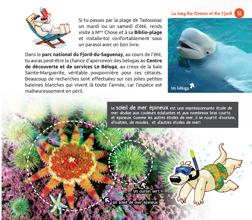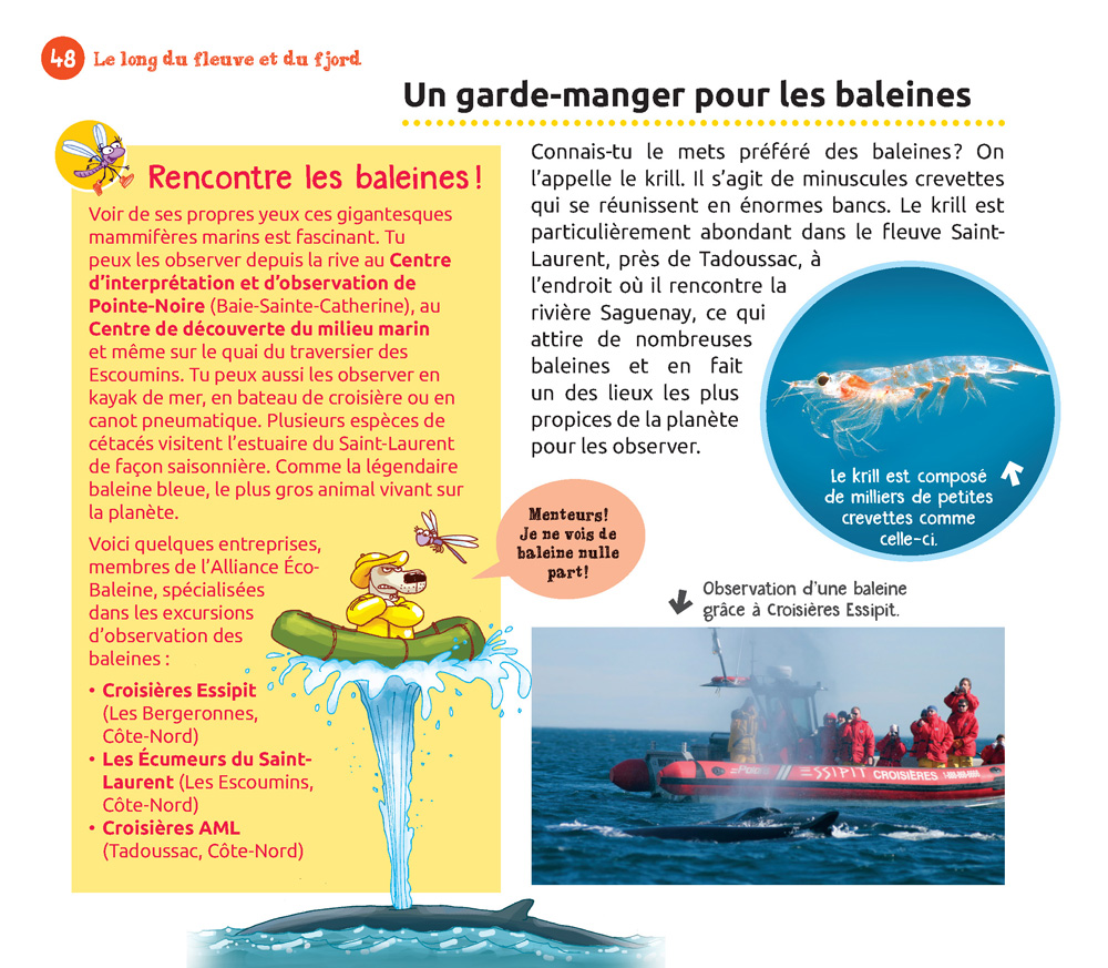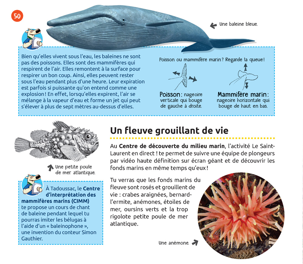 Le fleuve Saint-Laurent et ses baleines! Accueil / Contenus / Amérique du Nord / Le Canada, une question de géographie / Le Québec / Le fleuve Saint-Laurent et ses baleines! Une baleine de Minke ou petit rorqual dans le Saint-Laurent (balaenoptera acutorostrata) © iStock / Pascale Gueret Extrait du guide : J'explore le Québec Papier (livre entier) 19,95 $ Unique dans l'édition jeunesse, ce guide de voyage sur le Québec est le seul qui s’adresse aux enfants de 7 à 11 ans! Voir la suite Le fleuve Saint-Laurent et ses baleines! Savais-tu que le fleuve Saint-Laurent abrite 13 espèces de cétacés? Parmi celles-ci, notons le cachalot, le rorqual à bosse, le dauphin à nez blanc, le marsouin, le béluga et la baleine noire. Ces baleines fréquentent le fleuve surtout en été, car elles y trouvent une abondance de nourriture. On peut alors en observer plusieurs espèces depuis la terre ferme, notamment dans la région de la Côte-Nord, dont le petit rorqual et le rorqual commun, qui peut vivre plus de 100 ans! Les dents et les fanons La plupart des cétacés ont des dents (cachalot, dauphin, marsouin et béluga) et se nourrissent de toutes sortes de proies, petites ou grandes. Certaines baleines ont plutôt des fanons et se nourrissent de proies minuscules. Les fanons sont faits de kératine, comme tes ongles et tes cheveux! Ils agissent comme un peigne fin qui emprisonne le krill dans la gueule de la baleine. D'autres articles qui pourraient vous intéresser : LA ROUTE DES BALEINES SUR LA CÔTE NORD DU QUÉBEC LA PROMENADE FLEUVE-MONTAGNE – UN PARCOURS EN PLEIN AIR À SAVEUR HISTORIQUE LA BALEINE GRISE LE LAC SAINT-PIERRE